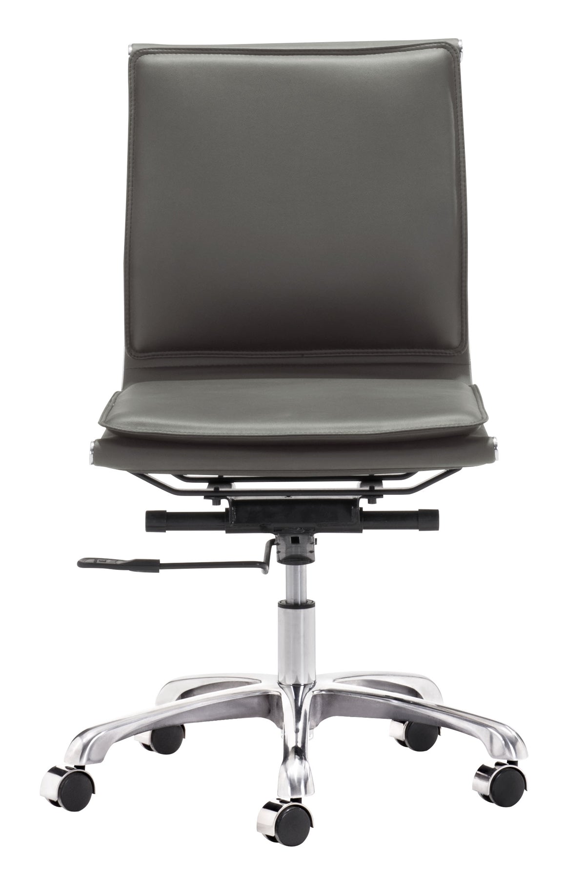 The Lider Plus Armless Office Chair from MODERNITURE. With its ergonomic shape, padded back and seat cushions, the Lider Plus armless chair works in comfort. It has a chromed steel frame with soft neoprene pads. DISCLAIMER: Zuo Modern Contemporary, Inc. is not affiliated with Herman Miller, Inc. and its products are not affiliated with Eames Aluminum Group or Soft pad products. .