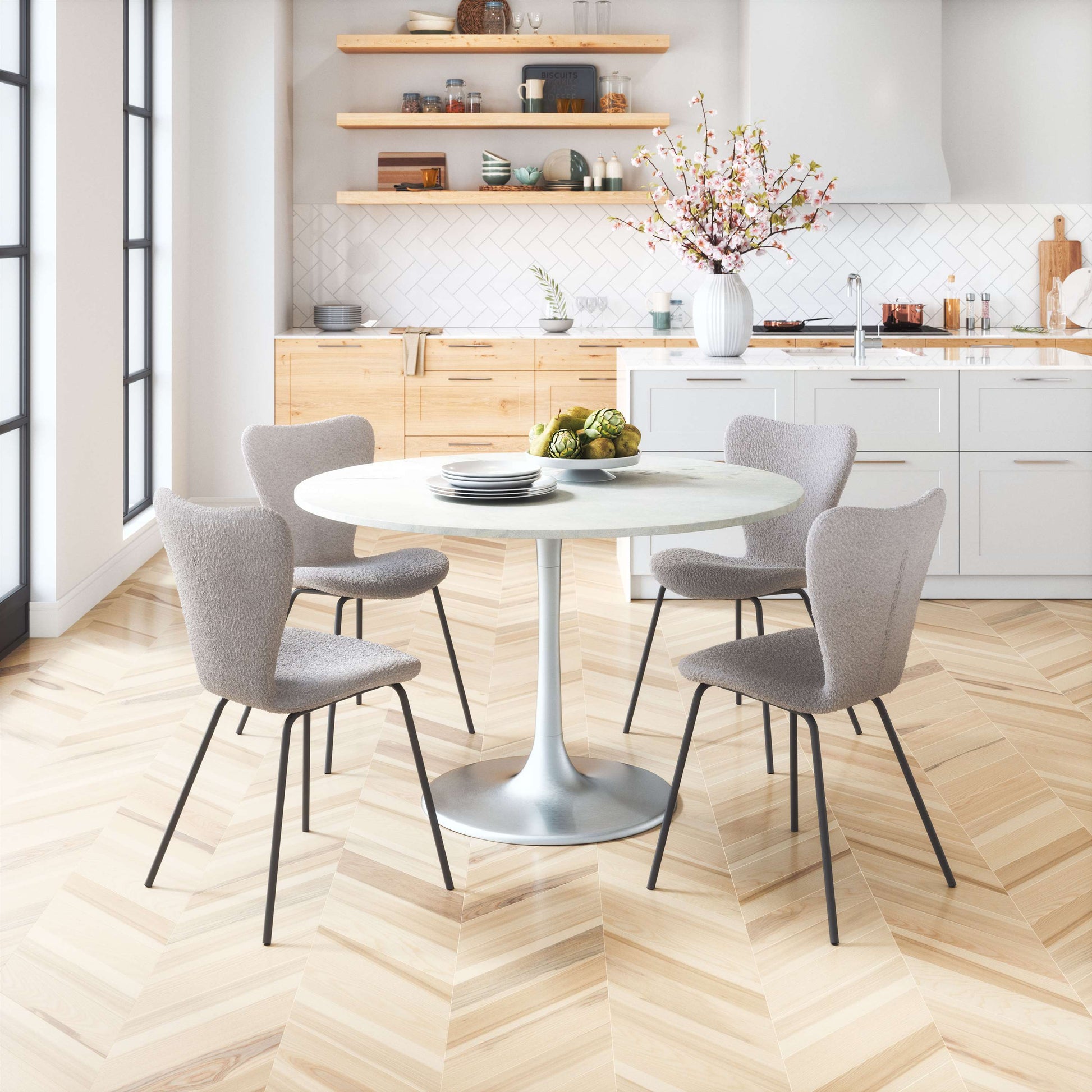 The Thibideaux Dining Chair (Set of 2) from MODERNITURE. This chair has a powder coated steel frame with a polyester fabric wrapped seat and is an urban and boho chic remix of a mid century modern classic that works great in any space, residential or hospitality.