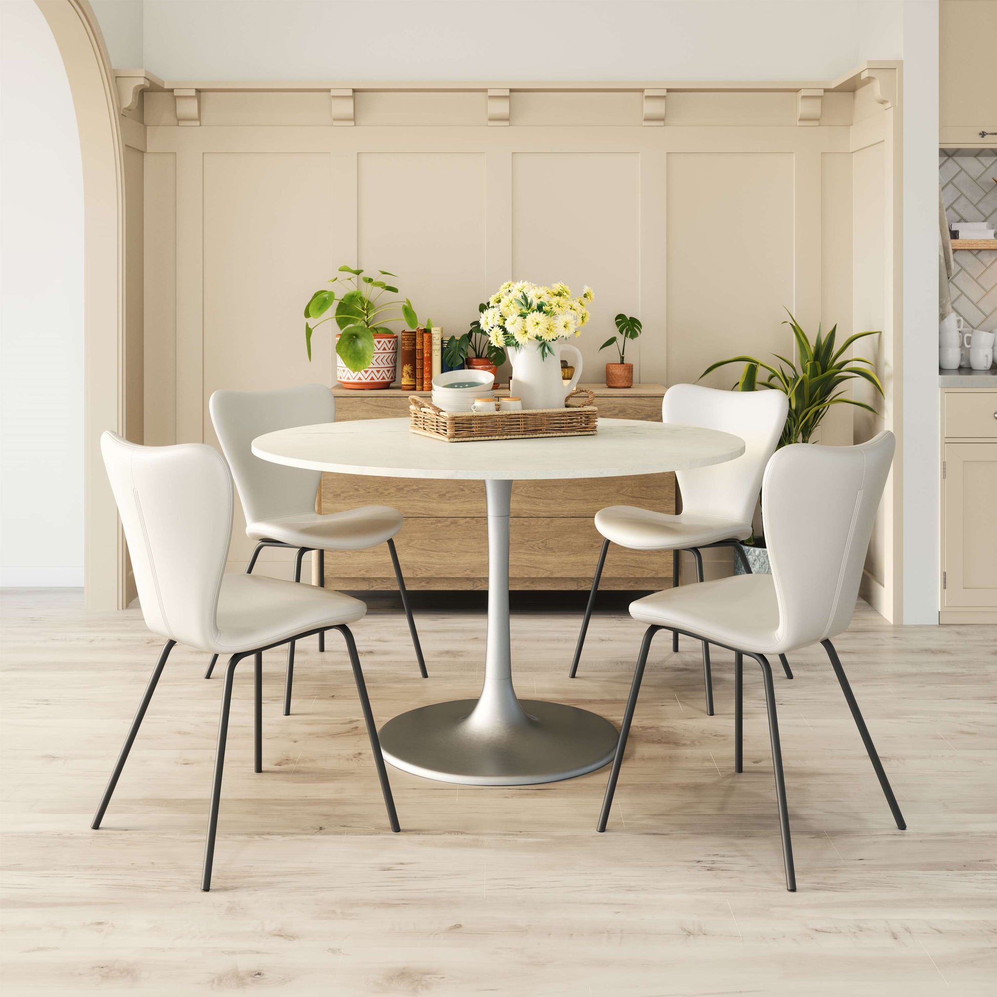 The Torlo Dining Chair (Set of 2) from MODERNITURE. This dining chair has an electroplated steel frame with a faux leather seat, it is glam and a deco remix of a mid century modern design that works great in any space, residential or hospitality.